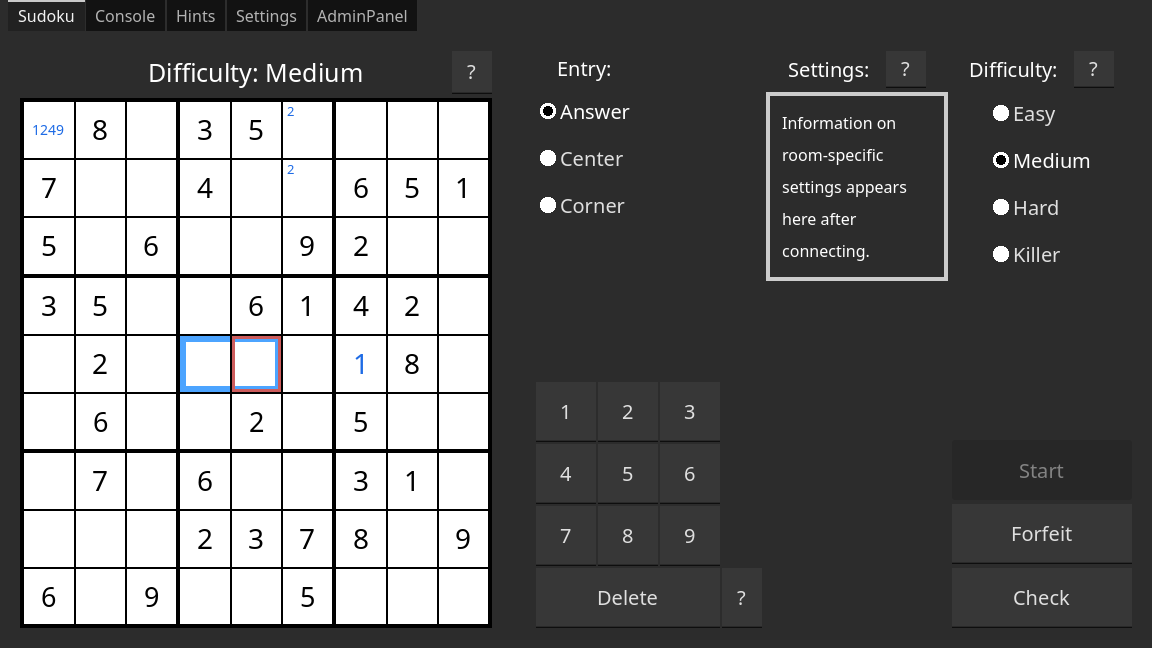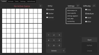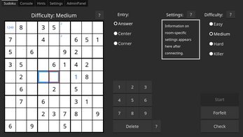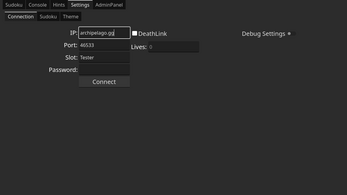 - 'Admin Panel' allows the Room Host of an Archipelago room to alter settings that will affect ALL APSudoku players connected to that room (such as modifying the odds of getting a hint after each puzzle, or disabling hint-earning altogether)